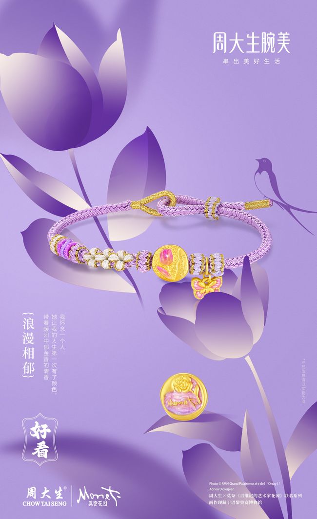 据悉,周大生腕美目前主推三种设计风格。时尚艺术风格,以大师艺术作品联名的莫奈花园、炽热梵高系列为核心,主打好看——注重产品颜值,让佩戴者变得好看。