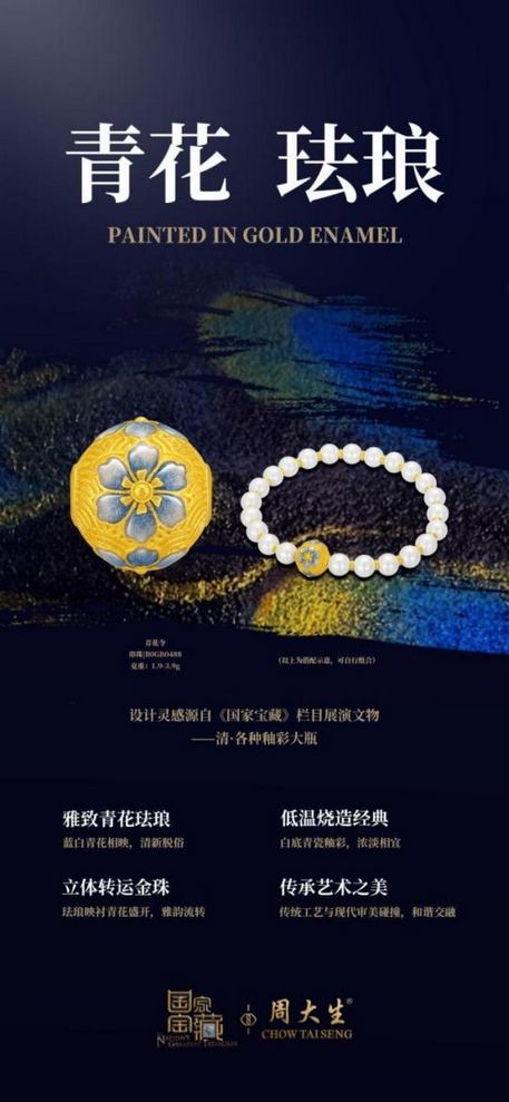 锦蓝宝华串珠 青花凝雅,瑞纹绕腕,周大生×国家宝藏IP联名系列锦蓝宝华串珠汲取了国宝文物中的缠枝纹样为设计灵感,这一纹样不仅承载着深厚的文化底蕴,更象征着福泽绵延,好运连连的美好祝愿。串珠以青花釉色珐琅精心绘制吉祥纹样,将珐琅点缀其上,如明珠生辉,为每一颗串珠增添了一份生动与细腻。而花丝工艺的巧妙运用,将每一处细节精心勾勒,完美展现无与伦比的匠心与高超技艺。