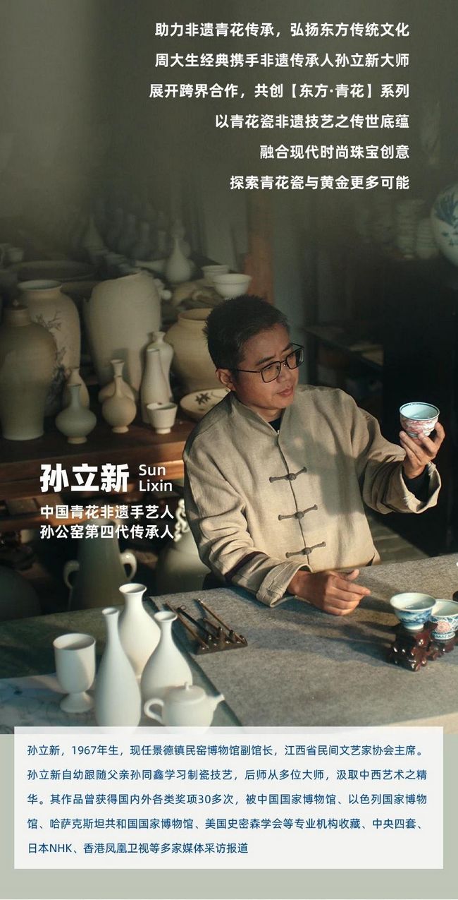 孙立新大师自幼学习制瓷技艺,后师从多位大师汲取中西艺术之精华。传承千年的守望,让非遗青花瓷技艺生生不息。此次周大生经典与孙大师的合作,致力于创造契合传承的时尚,书写永不过时的匠心故事,让未来传世的青花瓷中,能留下关于瓷与金的故事。值得注意的是,东方·青花系列历经大师的反复调试,青花瓷的静谧蓝白之美完美复刻。手工匠心描绘青花纹饰,以青花蓝为底色,分层叠加白色渐变,再经精细烧制,于黄金上再现青花瓷般的莹润质感,赋予东方·青花系列无可比拟的华彩。