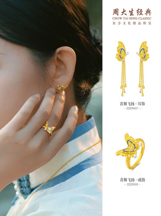 青舞飞扬 周大生经典东方·青花系列“青舞飞扬”设计灵感源自清康熙·五彩蝴蝶纹瓶,青蝶振翅,自瓷中翩然飞出,与金共生灵韵,穿越时空依旧闪耀如初。“青舞飞扬”用黄金、珍珠与钻石镶嵌的奇妙组合打造梦幻优雅的东方美饰,将古朴、优雅以及奢华等风格完美融合,让青花蝴蝶完成华丽蜕变,象征着自由美丽,蜕变新生。