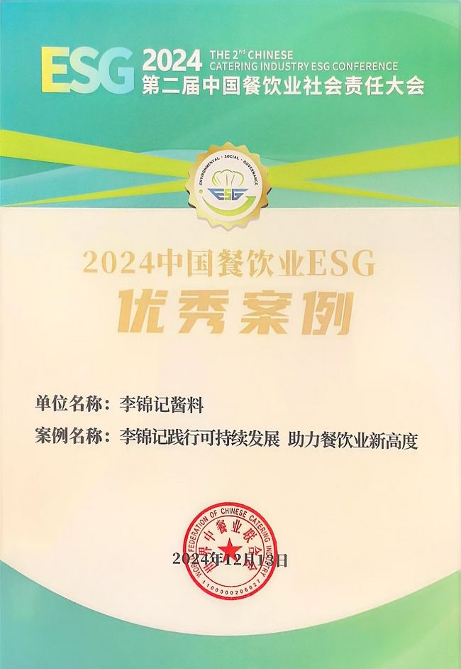 近日,由世界中餐业联合会主办的第二届中国餐饮业社会责任大会在四川德阳隆重召开,大会旨在推动中国餐饮业可持续发展,展现中国餐饮业在履行社会责任方面的积极努力,提升行业整体社会责任意识。会上,李锦记凭借可持续发展方面的卓越贡献,成功入选2024中国餐饮业ESG优秀案例,是对其在助力餐饮行业发展、推动中国味道香飘全球方面的肯定。