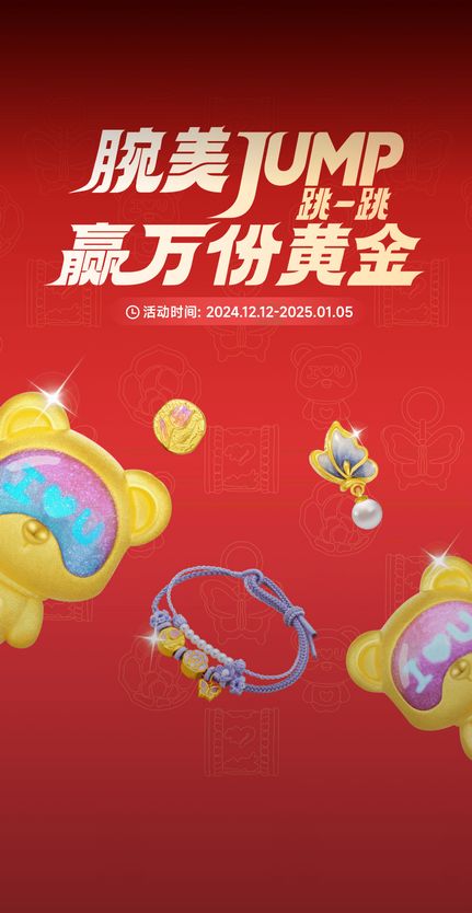 双旦暖冬礼遇不止于此,周大生还重磅送出更多“金”喜。活动期间进入“周大生美搭宝盒”微信小程序的【腕美跳一跳】活动专区,完成指定的游戏任务即可获得积分。周大生将依据积分排行榜进行奖励,排名前列的用户将有机会获得黄金鸡块、暴富串珠盲盒以及暴富金钞。同时,这些奖品亦可通过参与抽奖活动赢取。首次参与活动的用户将享有一次免费抽奖机会,开启双旦佳节的第一份幸运。