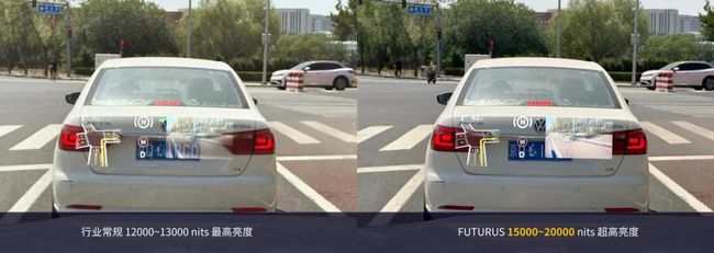 达成了以下突破 1.超高亮度:实现了远高于行业常规 12000~13000 nits 的最高亮度,达到 15000~20000 nits(可根据客户需求定制)。这一创新有效解决了 HUD 在极端场景下亮度不足的问题,使 HUD 能够适应 99%以上的使用环境,在例如强光下的路面反射、正前方有白色车辆或车尾反光等复杂条件下,画面依然清晰可见。同时,这一硬件性能提升,为 HUD 替代传统仪表提供了基础,也为 HUD 显示电子后视镜等功能的应用场景带来了更优质的体验。