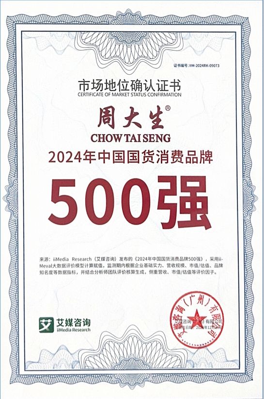 周大生荣耀上榜“中国国货消费品牌500强” 2024年12月26日,“艾媒新消费盛典暨2024年中国国货消费品牌500强颁奖典礼”在广州隆重举行,周大生珠宝以其卓越的品牌影响力和市场表现,与华为、美的、上汽等知名品牌荣登新消费盛典国货500强榜单行列,彰显出其在消费市场的领导地位。