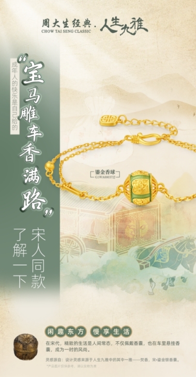 踏上时光之旅,我们穿越回那个以风雅著称的宋朝。漫步在青石板铺设的小巷,耳边传来街边集市此起彼伏的叫卖声。在茶馆酒肆里,文人墨客们焚香点茶,挂画插花,畅谈诗词歌赋,挥洒豪情壮志。在繁忙的日常生活中,宋人追求的不仅仅是物质的满足,更是精神上的富足,他们以独特的审美情趣和对生活的热爱,将生活的点滴雕琢成艺术。而周大生经典秉持弘扬东方文化的理念,推出东方风雅生活系列产品,今天,就让我们与周大生经典一同启程,去探索宋朝人的生活方式,去发现那些被岁月尘封的流行之美。 “鎏金香球”串珠 宝马雕车香满路,当我们踏上重返宋朝风雅生活的旅程,腕间那以鎏金银香襄为设计灵感的“鎏金香球”串珠,散发着阵阵香气。串珠采用精品倒模、古法黄金、珐琅等多种复合工艺精心打造,让表面色泽温润,华而不炫,贵而不显,每一处细节都彰显着宋人对品质生活的执着追求。佩戴上这款“鎏金香球”串珠,与宋朝人一同感受那份随时随地提升生活幸福感的惬意。