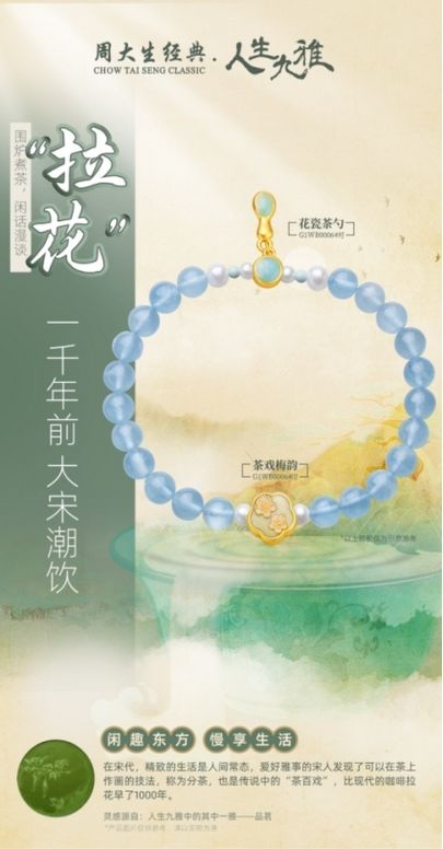 “花瓷茶勺”&“茶戏梅韵”串珠 在穿越时光的旅程中,我们佩戴以“茶百戏”为设计灵感的周大生经典“花瓷茶勺”、“茶戏梅韵”串珠,来到了重返宋朝风雅的第一站——品茗时光!“茶戏梅韵”串珠将粉色梅花映在灰绿色珐琅之上,蓝色“花瓷茶勺”串珠轻撇茶汤,颇具宋朝夜市煮茶漫谈的氛围,在这个“大宋拉花”盛行的时代,我们和宋朝人一样悠闲地享受生活,品味千年前的大宋潮饮。