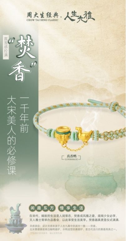 “真香鸭”串珠 车轮缓缓向前,我们在一屋前停下,推开屋门,腕间那以景德镇窑青白釉香炉为设计灵感的周大生经典“真香鸭”串珠散发着淡雅幽香,弥漫于屋内。串珠采用5D硬金电铸工艺打造,在精巧设计之下,既显轻盈又觉大气,其造型与屋内摆放的水鸭造型的熏香炉别无两样。在熏香的朦胧氛围之下,我们仿佛窥见了宋朝的绝代佳人款款走来,感受到宋朝人充满诗意的日常起居,沉浸于一场跨越时空的风雅之约。