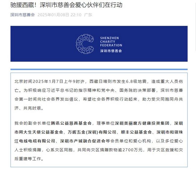 北京时间2025年1月7日上午9时许,西藏日喀则市发生6.8级地震,造成重大人员伤亡和大量房屋倒塌,牵动了全国人民的心。灾情面前,全国各地多方力量主动增援,迅速投入救灾一线。包括周大生天使公益基金会、腾讯公益慈善基金会、顺丰公益基金会、深圳市和谐珠江电线电缆有限公司等深圳市慈善会会员单位积极驰援西藏,共同向灾区捐赠款物逾2700万元,用于灾区救援和灾后重建等工作。同舟共济、共克时艰,各企业积极行动通过自己的绵薄之力为灾区人民送去温暖与希望,展现了“一方有难,八方支援”的中华民族传统美德和团结互助的精神,帮助受灾同胞早日度过难关。
