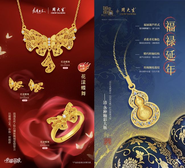 周大生精心准备了十万份黄金礼品,为消费者送上春节感恩回馈,主推的系列产品同样饱含着节日的温情。众所周知,春节不仅会见证诸多浪漫爱情的结合,还承载着家人团聚的喜悦。周大生聆听和感知消费者的情感需求,精选主推的幸福花嫁系列“花漾蝶舞”将花烟草的浪漫特质与蝴蝶所代表的爱情相结合,让婚恋的幸福与甜蜜在春节绽放。还有国家宝藏系列“福禄延年”汇聚青花缠枝莲纹、葫芦、蝴蝶等祥瑞元素,传递福运连绵,生生不息的美好寓意,也让春节团聚的喜悦更添深意。
