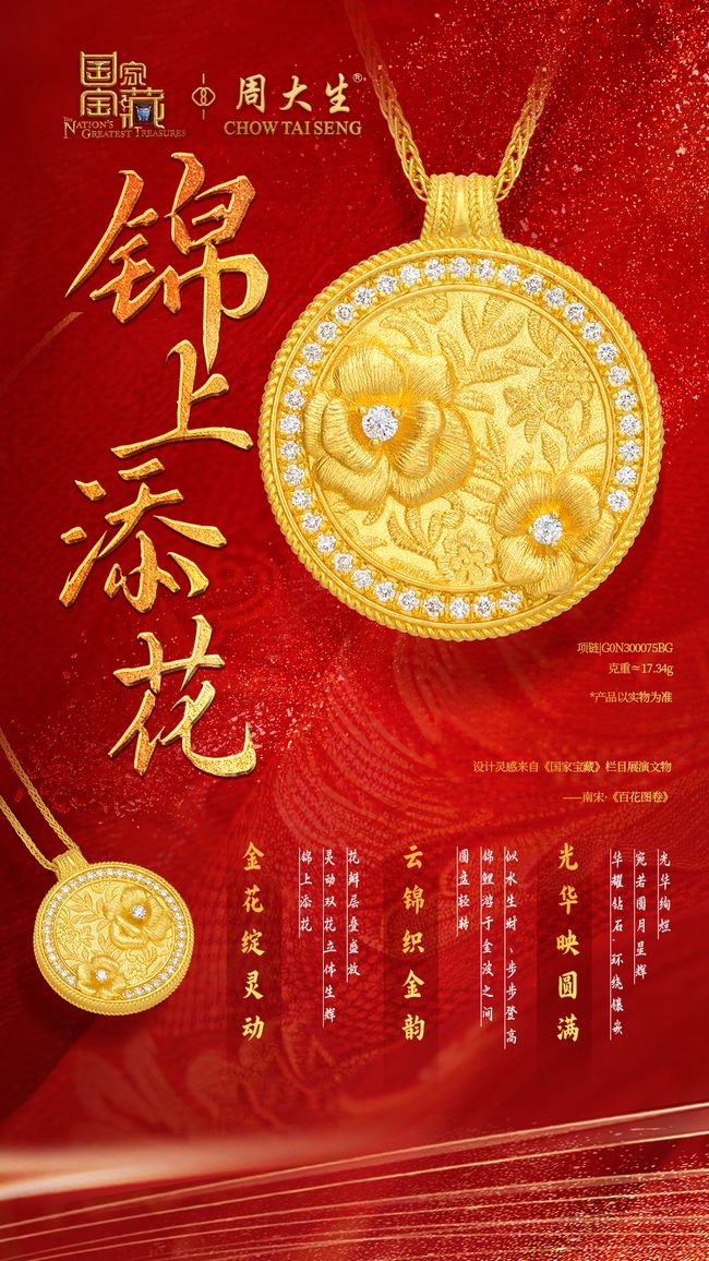 锦上添花 周大生国家宝藏·锦绣东方系列运用手工勾丝工艺,在“锦上添花”的肌理上勾勒出细腻的花卉图案,呈现出锦上添花、层次分明的视觉效果,借此传递锦上添花,富贵吉祥的美好祝福。此外,“锦上添花”亦结合了中式四和海棠、如意、圆形等传统中式元素,造型简洁大气,极具奢华格调,无论是日常时尚还是重要场合搭配总相宜。
