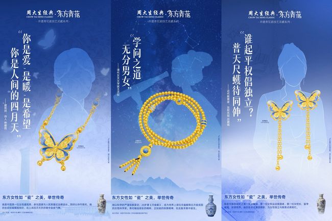 除此之外,周大生经典的当家产品——东方青花系列融合了古老东方传承千年的青花工艺,以细腻笔触晕染千年时光,惊艳世人眼眸,于岁月长河中绽放光芒。其中,“青舞翩跹”套系产品将蝴蝶的绚烂与青花的淡雅巧妙结合,寓意东方女性从不被世俗的眼光所束缚,以独特的姿态在世间绽放光彩;“冰壶秋月”手镯如同秋夜中的一轮明月,清冷而皎洁,静静悬于夜空。这正如古往今来的东方女性,她们或许不张扬,却以星点光亮,汇聚成温暖而强大的力量,铸就一座座抵御风雨的坚固壁垒;而“青花飞舞”串珠在腕间轻绕,四合如意造型与细腻瓷白珠子相映,宛如东方女性的优雅写照,诉说着对和谐美满生活的期许。