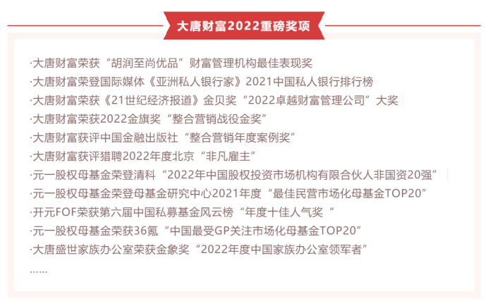 截至2022年12月底,大唐财富已累计荣获各类权威奖项超153项,其中综合荣誉90项,产品奖项 63项。连续 7 年入选行业权威的投中榜单,累计获得20 项投中提名。其中,2022年荣获各类荣誉33项。